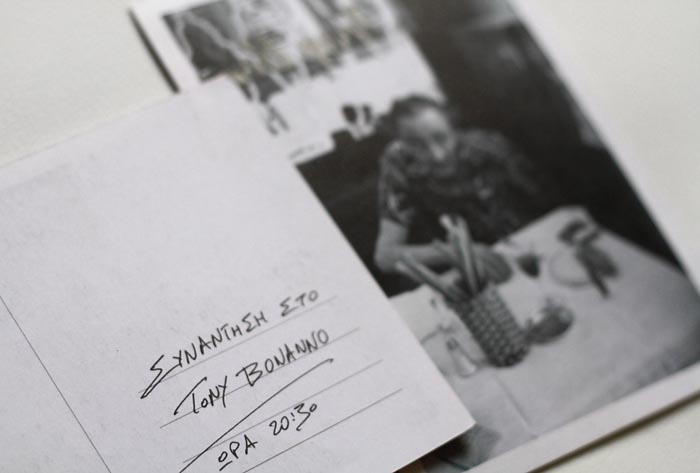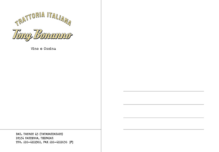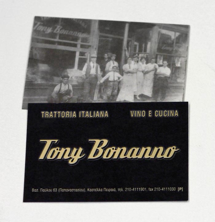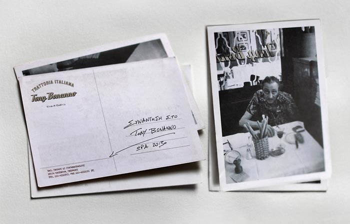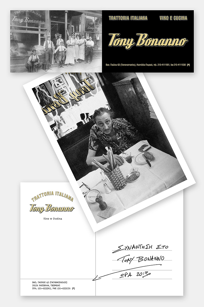 ............................................ Interiors Projects Logos Covers Books Prints Publications Videos ............................................ Sti Skia Ton Vraxon Urbanity Caratex Lookbook King George Simplicity The Tomb of Christ Paradise Geometry Lazy Boy Team We Will Always Have Greece Moodlikeme Darling Bar Echo Beach Concept Store Metropolis Tribeca Meze Tony Bonanno Tora Tora Tora Plus X Top Spot MMD Shiping Services National Printing Office 9 Magazine Ethnodata ............................................ Tony Bonanno Tratoria Italiana Identity / Logo / Cards / Catalogues Invitations / Signs / Images 2005 Kastella, Piraeus Original photographs by the client's archive |